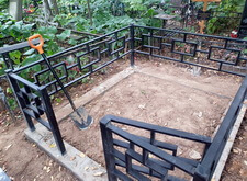 Первым делом мы демонтировали с территории участка кресты и ограждение, параллельно готовя землю к брусчатке. Когда подготовительные работы были завершены мы установили оградке, по низу которой сделали периметр из опалубки для последующей заливки бетоном.